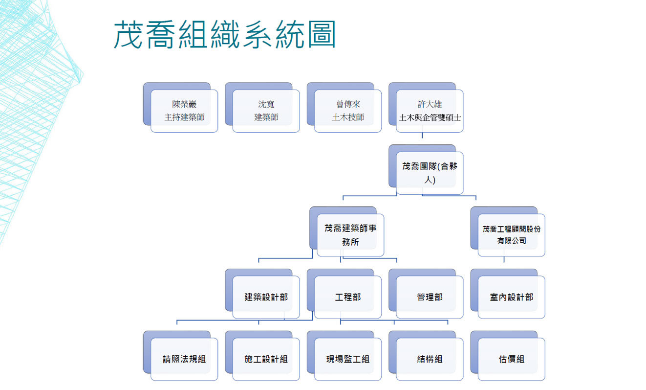 建築是一門高度整合的工程藝術,每一個介面緊密相連、息息相關,可說牽一髮動全身,稍一不慎,往往『差之毫釐,失之千里』。因此,如何整合各個利害相關人(Stakeholders)之目標變得極為關鍵。多年來,茂喬經驗豐富兩位建築師、土木技師、國際專案管理師(PMP)及所有同仁除積極引進各種資訊與管理工具外,更針對每一個案的特殊考量因素,組合成具有專案導向的團隊,以如期、如質、如預算達成設定目標及績效,提升客戶滿意度,創造多贏情境為努力標竿。全體同仁稟持『敬業樂群、誠信服務』之信念,以『兢兢業業、誠懇踏實、共創永續前景』為期許,也期盼各企業先進給予更多指教、鼓勵與支持,攜手共創卓越企業與團隊。